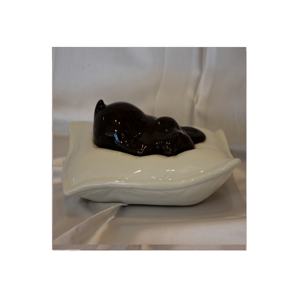 Urna in ceramica a forma di cane che dorme sul cuscino.