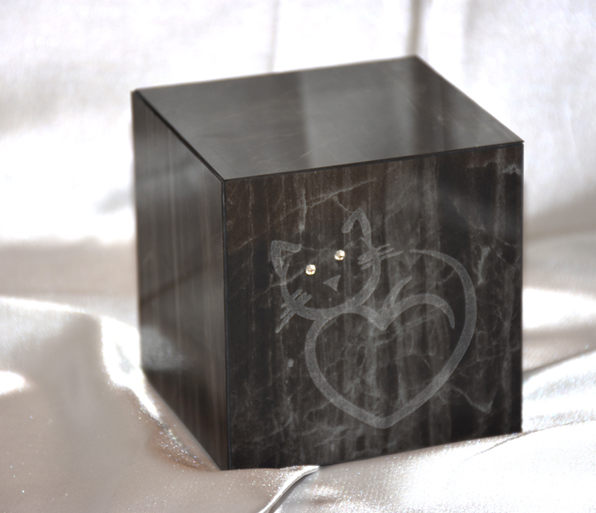 Urna gres a cubo nera con incisioni stilizzate di un gatto, con due punti luce sugli occhi.